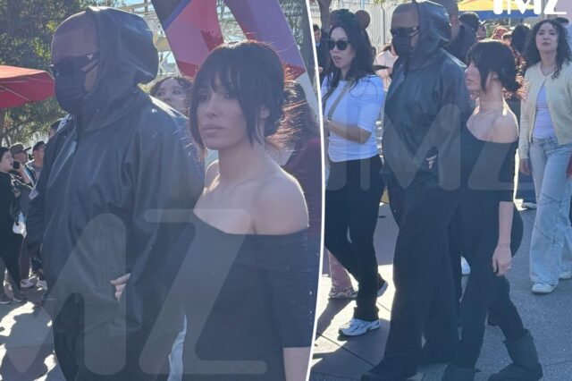 48-летний Уэст также надел полностью черный ансамбль в тематическом парке Анахайма, Калифорния, включая куртку с капюшоном и спортивные штаны.